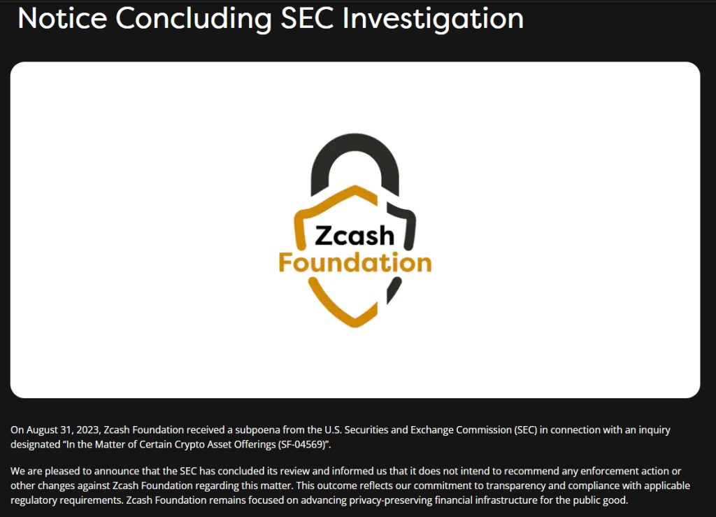 SEC завершила дворічне розслідування Zcash Foundation 14 січня 2026 року без звернення до суду. Розслідування, розпочате через повістку в суд у серпні 2023 року, перевіряло, чи є ZEC пропозицією цінних паперів. Закриття узгоджується з більш широкою відмовою SEC від примусового застосування криптовалюти під керівництвом голови Пола Аткінса.