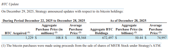 Станом на 28 грудня Strategy зберігає 672 497 BTC, придбаних приблизно за 50,44 мільярда доларів із середньою ціною покупки 74 997 доларів за біткойн.