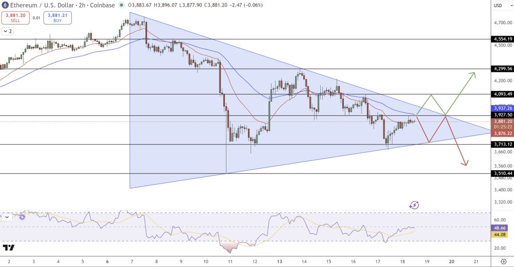 З технічної точки зору, Прогноз ціни Ethereum залишається нейтральним — це консолідація в межах симетричного трикутника, шаблон, який часто передує різким проривам. Верхній рівень опору знаходиться біля 3937 доларів США, збігаючись із 100-EMA, тоді як підтримка становить близько 3713–3510 доларів США, де збігається 50-EMA.