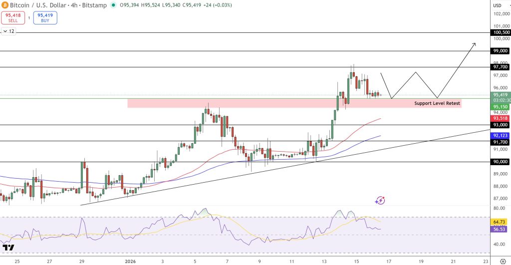 Прогноз курсу біткоіни залишається бичачим, оскільки 4-годинний графік BTC тепер показує формування бичачого прапора після підйому з регіону 90 000 доларів. Прайс повторно перевіряє зону підтримки 95 150 доларів США, вирівнюючи її з нижньою межею прапора.