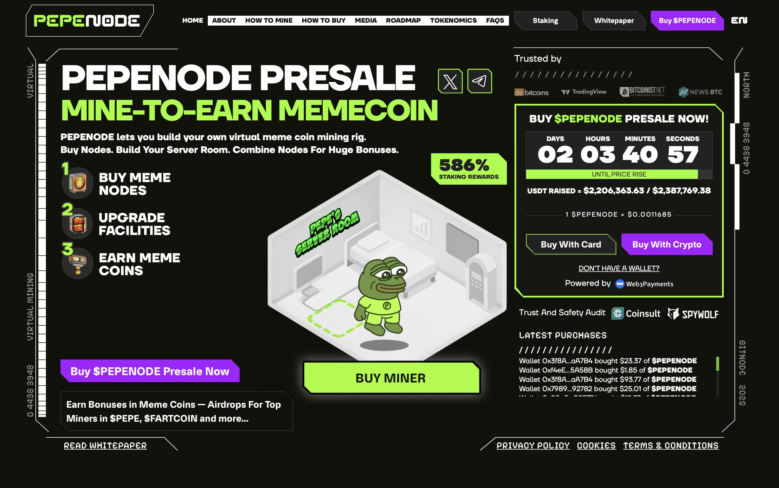 Зокрема, це дозволяє користувачам створювати та запускати власні віртуальні майнінгові установки, які вони можуть розвивати, просто витрачаючи PEPENODE на більше вузлів.