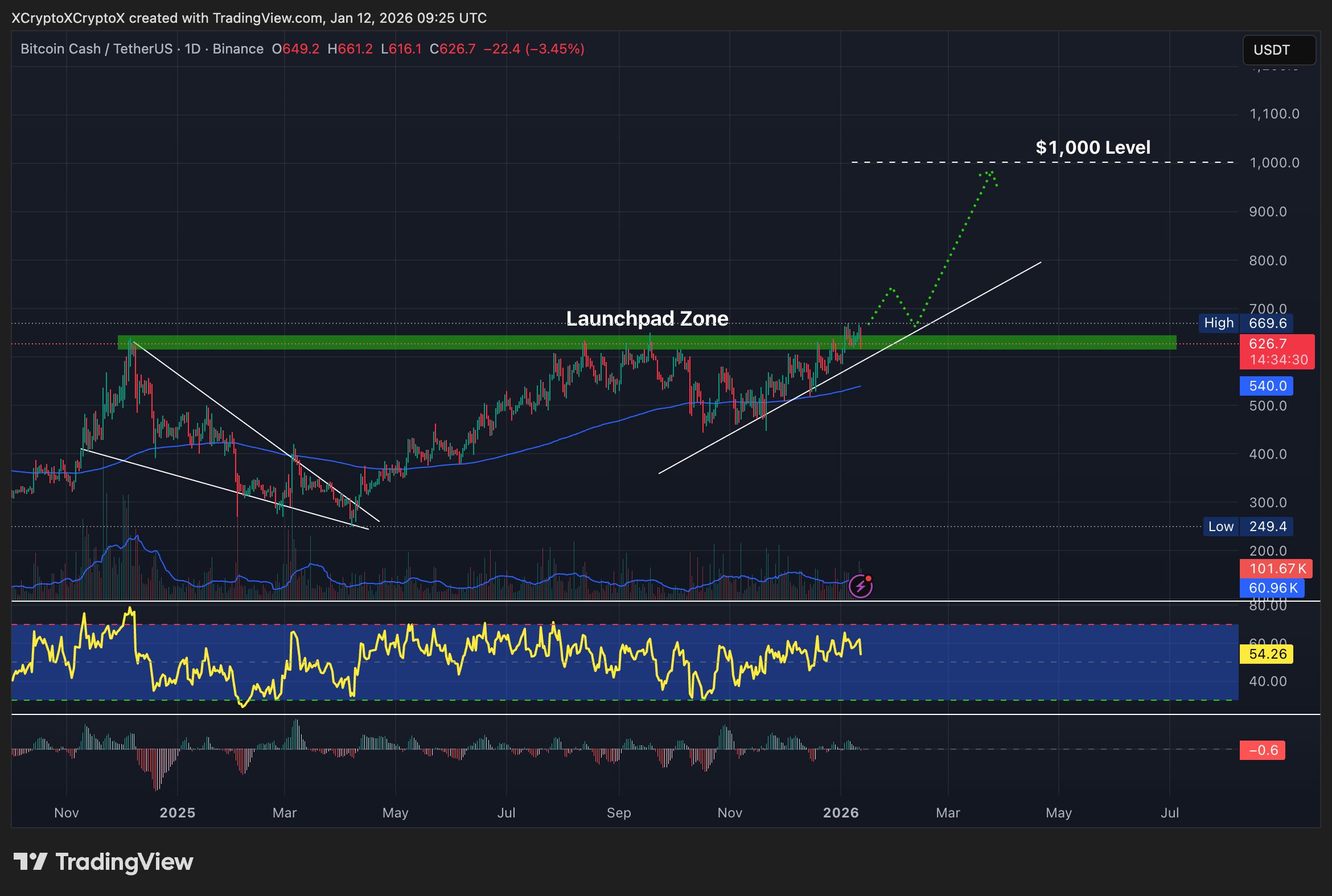 Поточний Прогноз курсу Bitcoin Cash виглядає все більш оптимістичним, а структура діаграми вказує на можливий рух до Рівень 1000 доларів якщо поточні зони підтримки зберігаються.