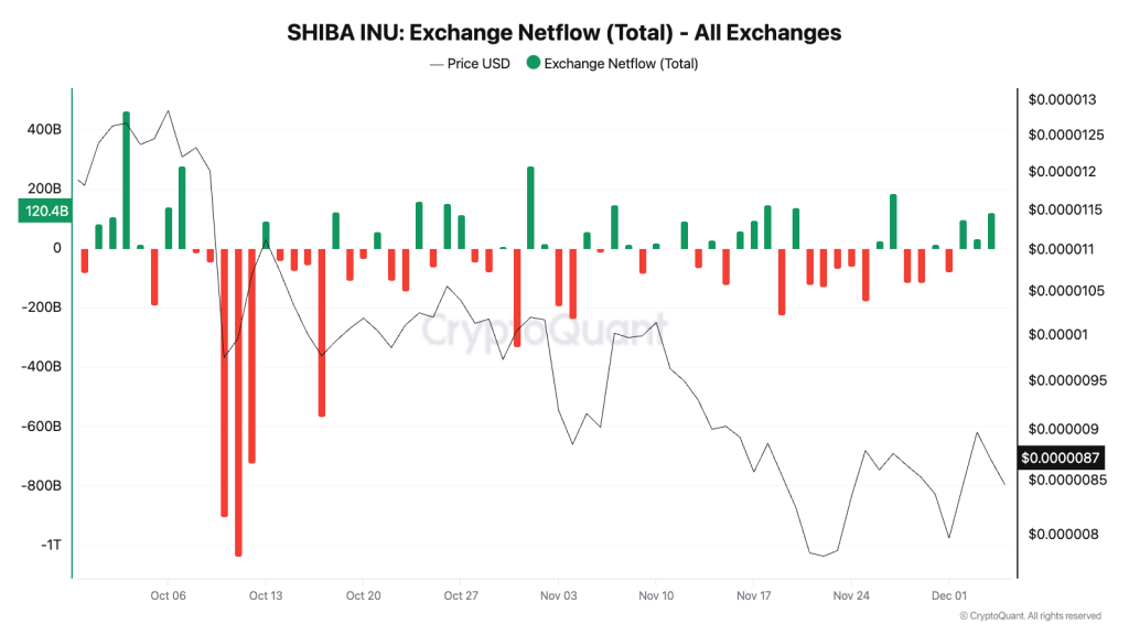 Це повторювана модель, дивлячись на діаграму чистого потоку бірж від CryptoQuant, потоки SHIB до бірж переважно були негативними, що свідчить про накопичення. Незважаючи на це, ціна продовжувала знижуватися протягом останніх трьох місяців, оскільки ринок мемкойнів не був у найкращій формі.