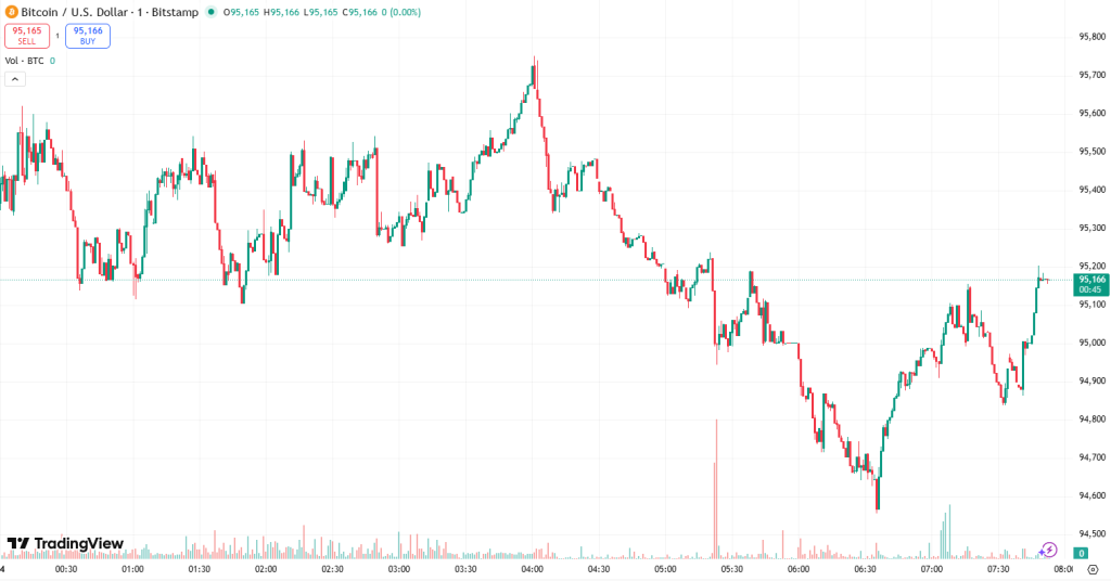 Bitcoin (BTC) подорожчав на 3,4% з цього часу вчора, зараз торгується на рівні 94 953 доларів США.