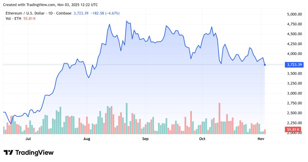Тим часом Ethereum торгується на рівні 3723 доларів, що на 4,67% менше за останні 24 години. Монета втратила тягу після того, як не змогла підтримати імпульс вище 3950 доларів, консолідуючись у діапазоні 3700–3800 доларів.