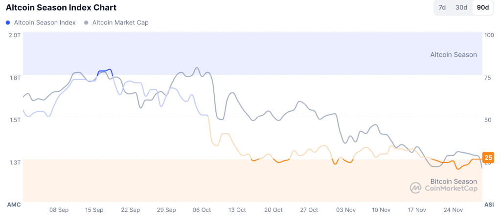 Крипторинки втрачають мільярди, коли глобальний ринок вступає в грудень 2025 року. Понад 637 мільйонів доларів у довгих позиціях було ліквідовано під час падіння, а індекс сезону альткойнів впав до 25, що вказує на слабкий розмах за біткоіни.