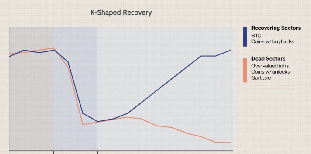 Його ілюстрація показує, що відбулося б K-подібне відновлення, коли в майбутньому вижили б лише найкращі криптовалюти, такі як біткойн та інші з механізмами викупу та моделями періодичного отримання доходу.