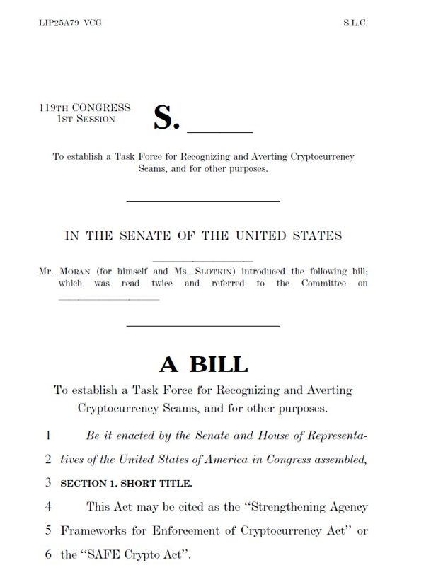 Пропозиція, відома як Закон про зміцнення агенційних рамок для забезпечення виконання закону про криптовалюту, або SAFE Crypto Actпредставили сенатор Елісса Слоткін, демократ від Мічигану, і сенатор Джеррі Моран, республіканець від Канзасу.