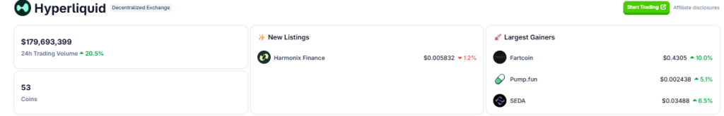 Останні дані шоу Hyperliquid звітує про понад 169 мільйонів доларів США в 24-годинному обсязі торгів, при цьому спотові пари вносять значну частку разом із рідним токеном HYPE та основними активами, такими як BTC, ETH, SOL і USDC.