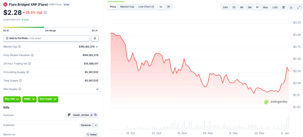 Ринкова активність навколо FXRP зросла після запуску. Дані CoinGecko шоу що токен торгується близько 2,29 дол. США, з оборотним запасом приблизно 86 мільйонів токенів і ринковою капіталізацією близько 197 млн дол.