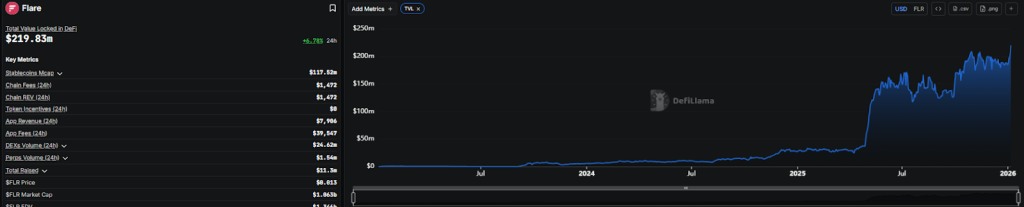 Для Flare інтеграція зміцнює її ширшу стратегію DeFi, орієнтовану на XRP. Мережа на даний момент тримає майже 220 мільйонів доларів загальної вартості заблоковано, при цьому обсяг децентралізованого обміну різко зріс за останній тиждень.